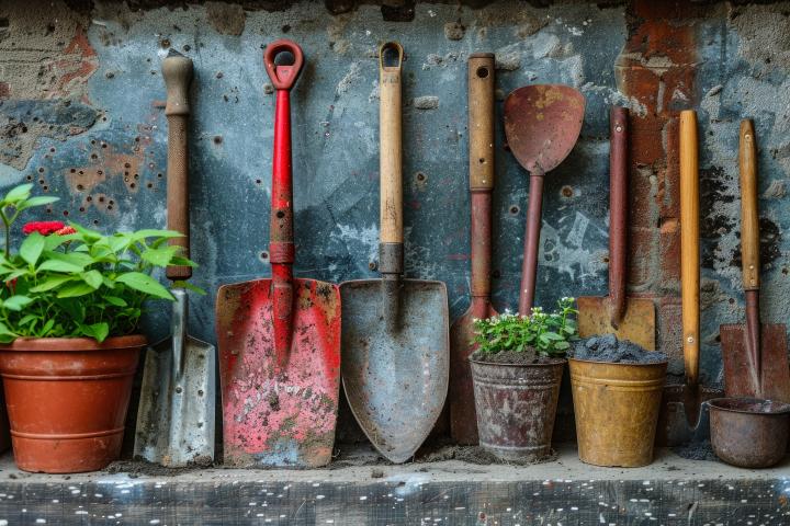 Bij spades, tuinkrabbers, schoffels, harken, rieken en plantschoppen kan je het vuil eenvoudig verwijderen met een (staal)borstel. Smeer de metalen onderdelen ook regelmatig in met wat huishoudolie om de oppervlakken glad en glanzend te houden. Houten stelen en handvaten zet je best twee keer per jaar in lijnzaadolie.
